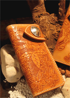 紅型カービングスタイルのメディスンバックは、表面全面にほぼカービングを施してあり、サイドはダブルステッチをまいてあります。 定番のメディスンバックと同じく、マチの部分はアコーディオンマチを採用し、モルガンダラーにて鹿ひも止めとなっている。贅沢な商品に仕上がっております。