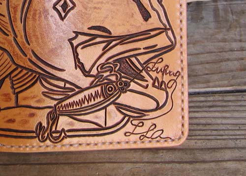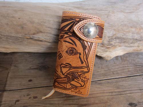 釣り好きならたまらない、魚のカービングが新発売!!釣り師はデカイ魚を釣った時魚拓をとったりします、魚拓では持ち歩く事はできませんが、ロングウォレット(財布)の表面にダイナミックにレザーカービングで表現しました。 |
