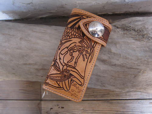釣り好きならたまらない、魚のカービングが新発売!!釣り師はデカイ魚を釣った時魚拓をとったりします、魚拓では持ち歩く事はできませんが、ロングウォレット(財布)の表面にダイナミックにレザーカービングで表現しました。 |