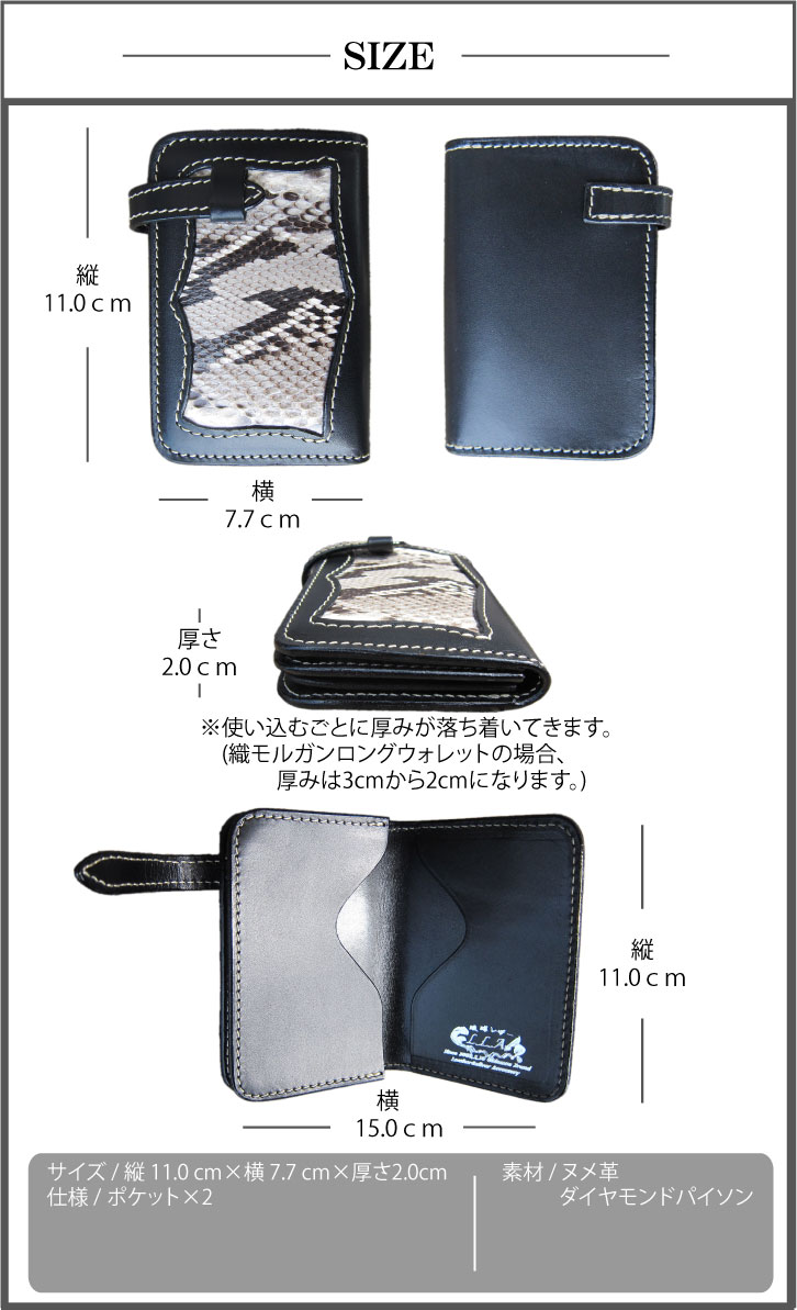 表面は、ベルト止めになっており内側は、40〜50枚入れることができるマチ付きのヨコ型の名刺入れ。量を多く入れたい方におすすめです。