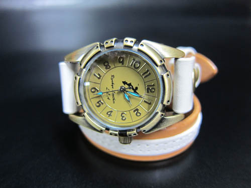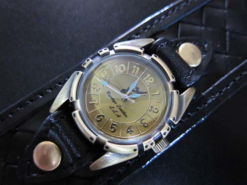 ケースを真鍮で製作し文字板はゴールド 、アワーマークもゴールドにする事で、渋く作る事ができました。時針などはターコイズブルーを入れて鮮やかさも強調されています。