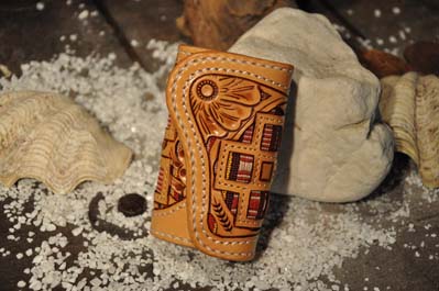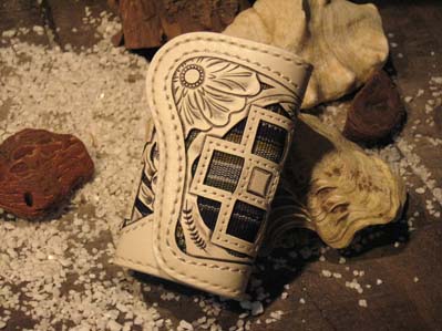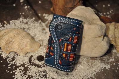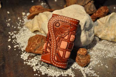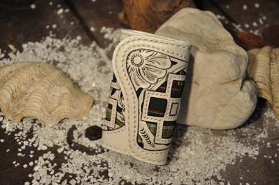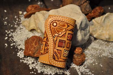 琉球レザーLLAが贈る新ブランド、“UCHIDENOKOZUCHI”。従来のレザーカービングスタイルを一新。レザー表面にミンサー織の「四」と「五」をあしらい、さらに切り抜き加工を施しました。琉球レザーLLA・小物シリーズの使いやすさそのままに、沖縄の伝統技術である織物と、革細工の高度な技法が集結されています。