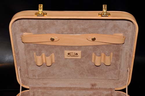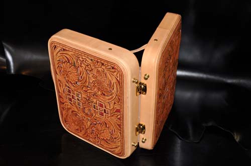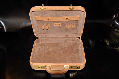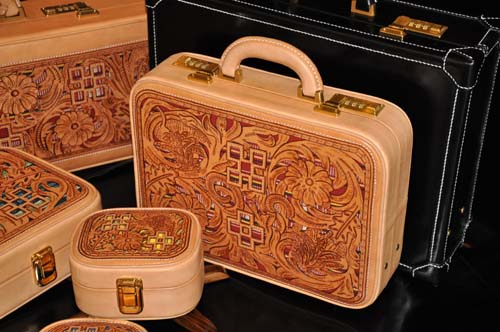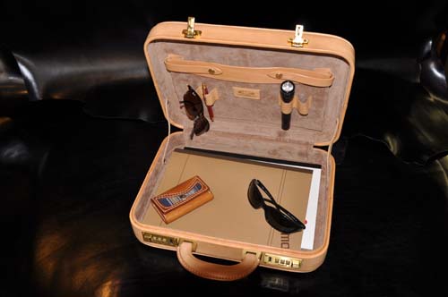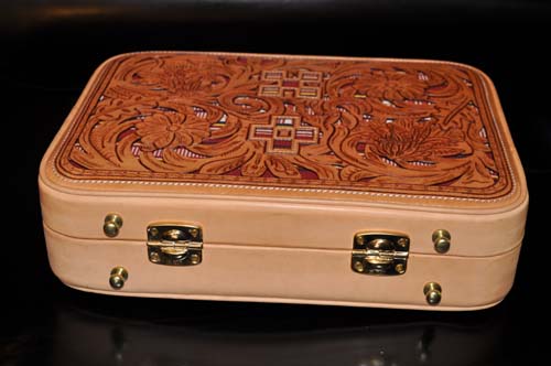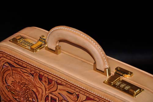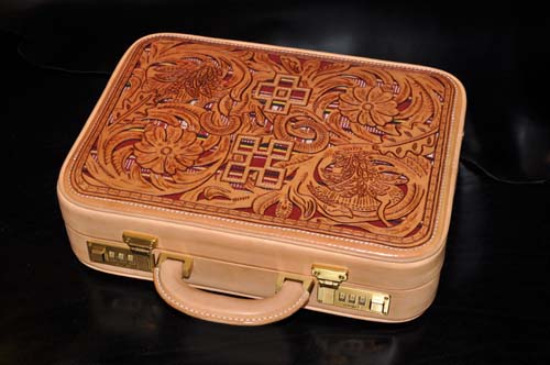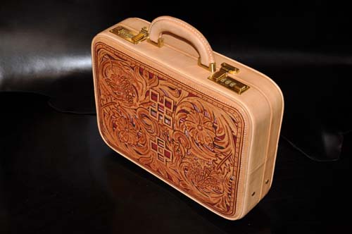 イタリア直輸入のヌメ革に両面ウチデノコズチカービングを施し、内装にはピッグスエードとヌメ革で仕上げたアタッシュケース、琉球レザーオリジナルパイピング仕上げのこのケースはカービングを引き立てる作りとなっており、持つことで優越感を味わえる逸品です。