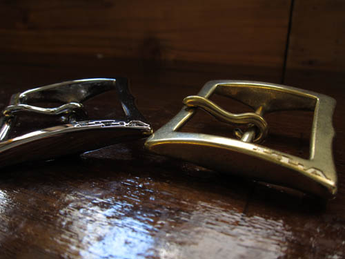 真鍮にメッキをかけた、メッキ(銀)と真鍮(金)の2タイプです、38mm幅は一般的なサイズになりますので、手持ちのベルトと合わせてみてはいかがでしょうか。