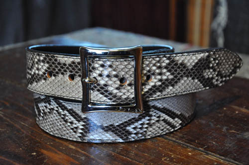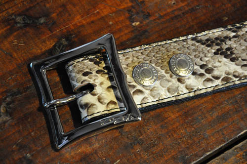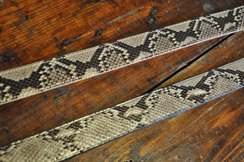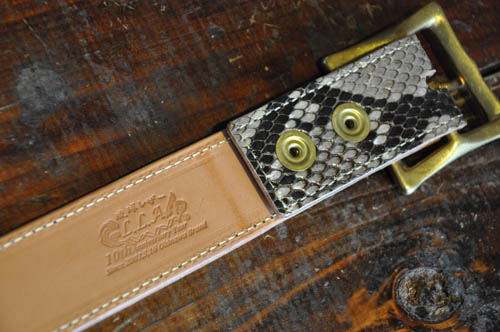 サドルレザー4mm厚に1mm厚のパイソンを貼りつけ約5mmに仕上がっております。