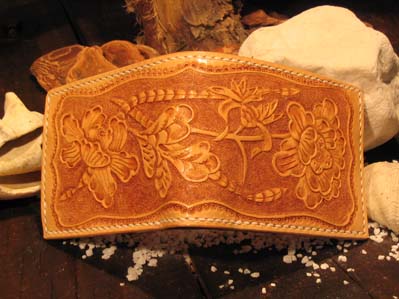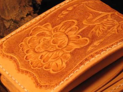 沖縄には古くから紅型という染物があり、その古典柄を生かしレザーカービングを施した今年の新作財布です。