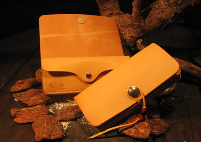 コインケース部分のボタンを外すと、カード入れが2ヶ所出てきます。 中央部分の札入れは大きく広がって取り出しやすく、領収書などを分けて入れられます。表面は、コンチョに革ひも止めになっており、これぞ手縫いの革財布と言える一品です。