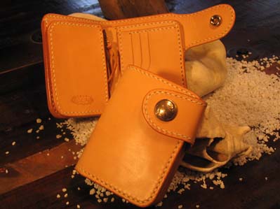 ベルト留めの2つ折財布。小さいけれど3ヶ所も隠しポケットがついているので、カードを分けて持てる優れもの。5セントコンチョボタンが付いており、ジーンズのポケットに入れることも可能な商品です。