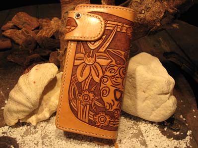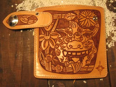 当店一番人気のロングウォレットに大きなシーサーをカービング。ベルト部分に大きなコインの入ったこだわりの商品となっております。小銭入れは、ファスナータイプを採用し、カード入れは計6ヵ所、まとめてカードを入れる隠れポケットもあります。ジーパンバックポケットに差し込んだ時、コインの入った部分が見えるため、ウォレットを目立たせたい方へおすすめ。