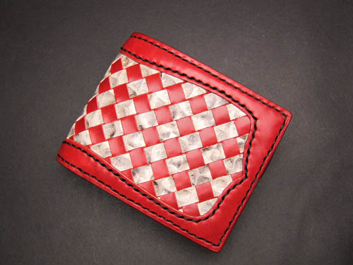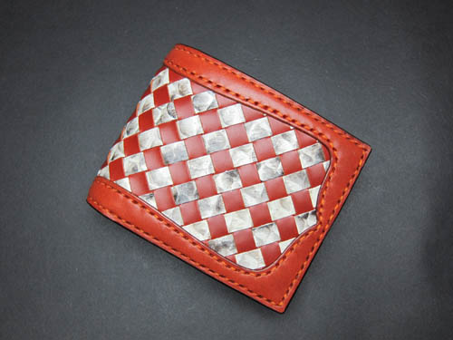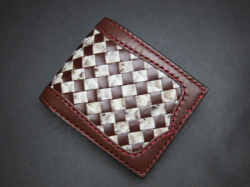 ヌメ革に裁断したパイソンを一本一本丁重に 編み込んでいく時間のかかる作業です。 |