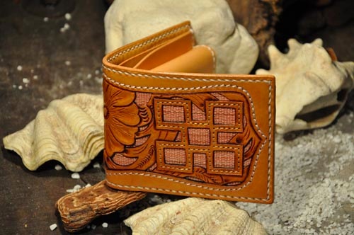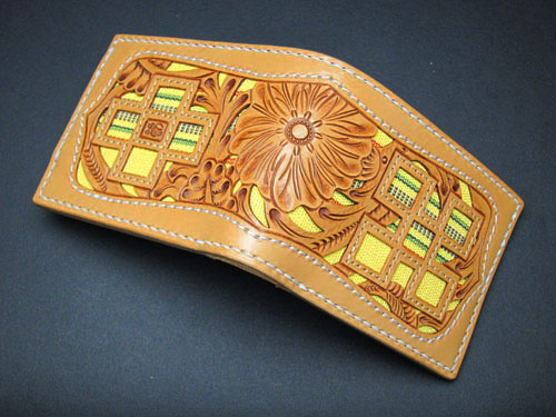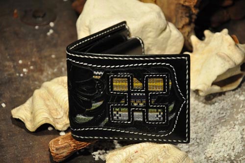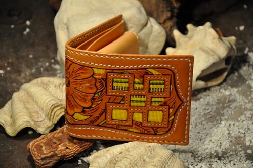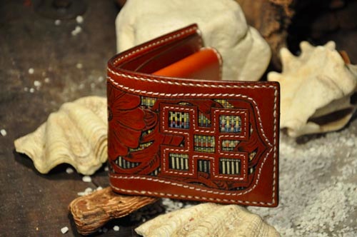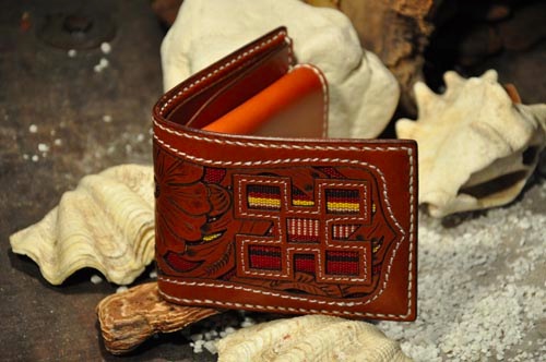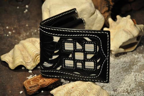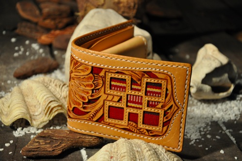 琉球レザーLLAが贈る新ブランド、“UCHIDENOKOZUCHI”。従来のレザーカービングスタイルを一新。レザー表面にミンサー織の「四」と「五」をあしらい、さらに切り抜き加工を施しました。琉球レザーLLA・ウォレットシリーズの使いやすさそのままに、沖縄の伝統技術である織物と、革細工の高度な技法が集結されています。